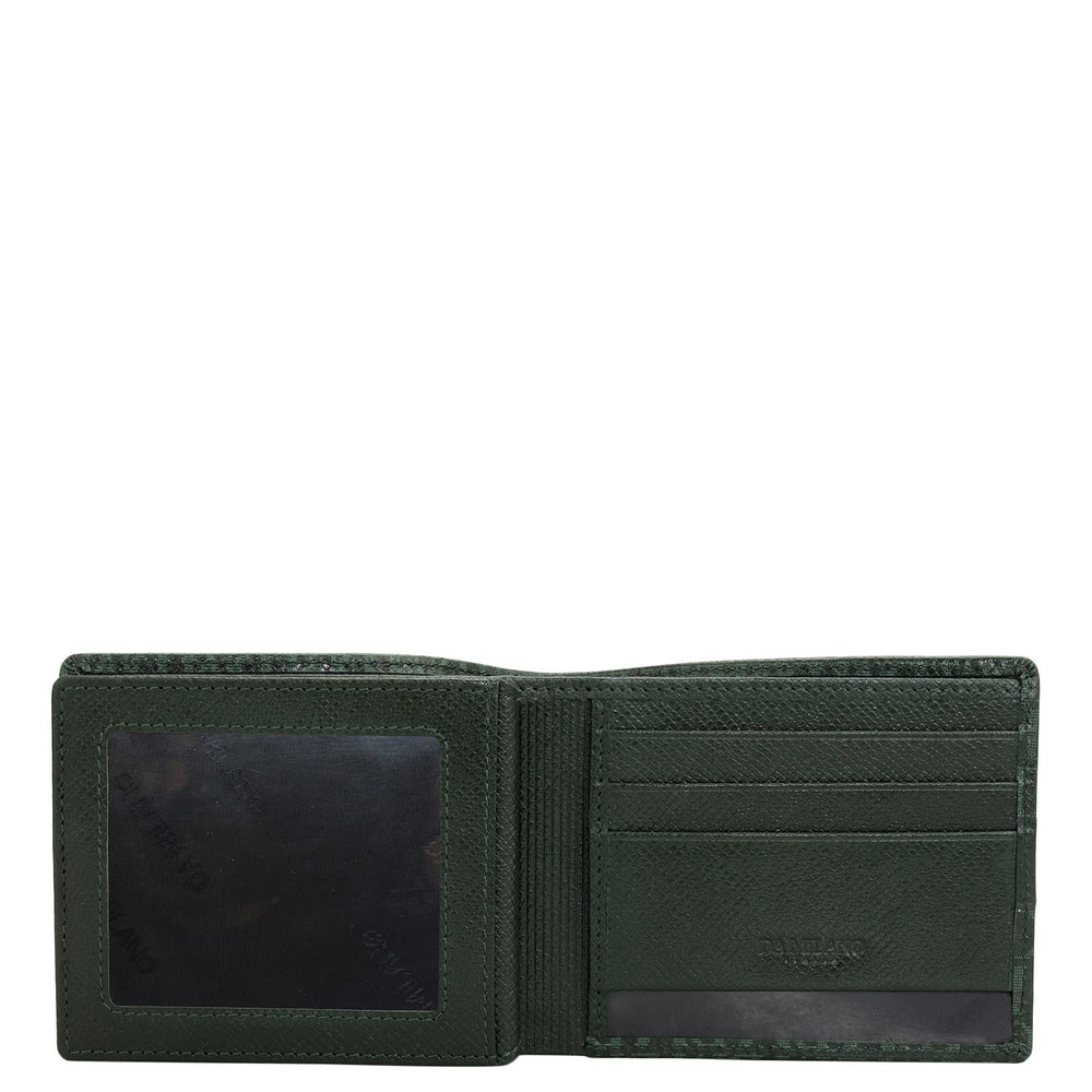 Crafted from textured leather, Da Milano men's bifold wallet offers a compact yet stylish design. Featuring easy-to-organize compartments, card slots, and pockets, it combines practicality with elegance. Subtle branding on the front enhances its refined appearance.
