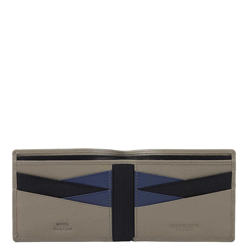 Crafted from textured leather, Da Milano men's bifold wallet offers a compact yet stylish design. Featuring easy-to-organize compartments, card slots, and pockets, it combines practicality with elegance. Subtle branding on the front enhances its refined appearance.