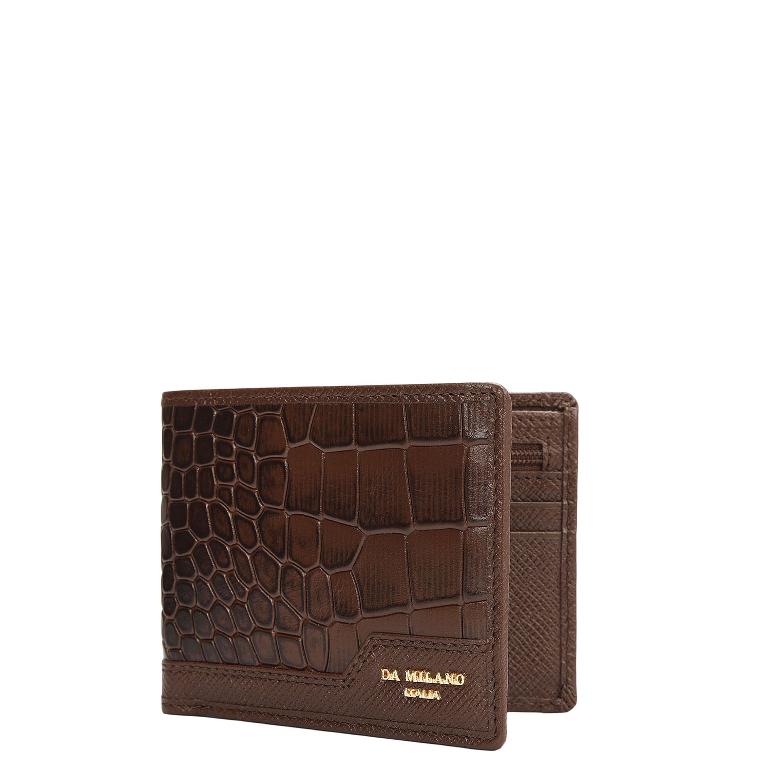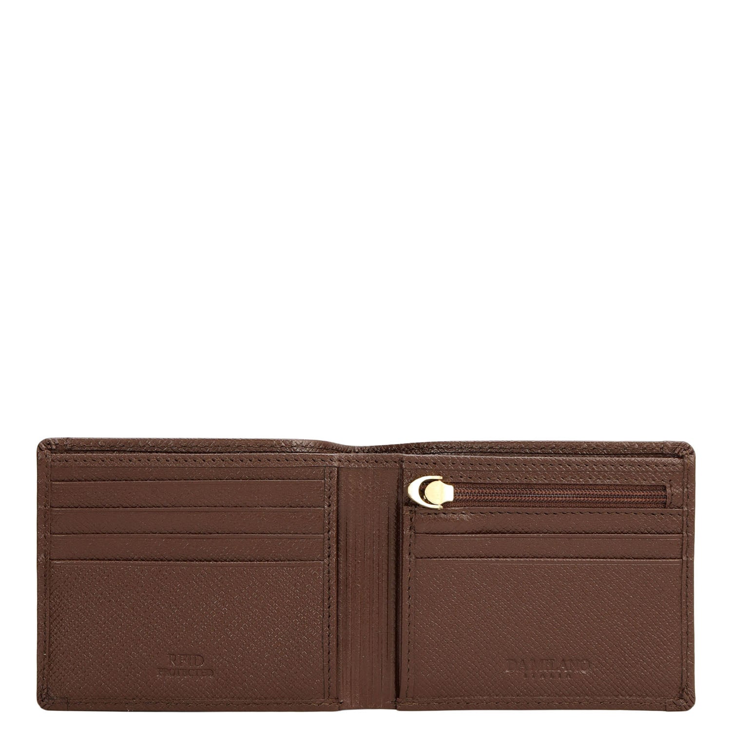 Crafted from textured leather, Da Milano men's bifold wallet offers a compact yet stylish design. Featuring easy-to-organize compartments, card slots, and pockets, it combines practicality with elegance. Subtle branding on the front enhances its refined appearance.