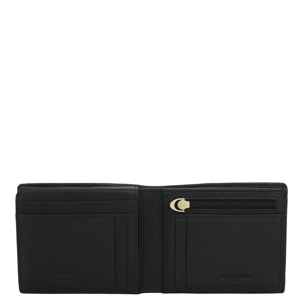 Crafted from textured leather, Da Milano men's bifold wallet offers a compact yet stylish design. Featuring easy-to-organize compartments, card slots, and pockets, it combines practicality with elegance. Subtle branding on the front enhances its refined appearance.