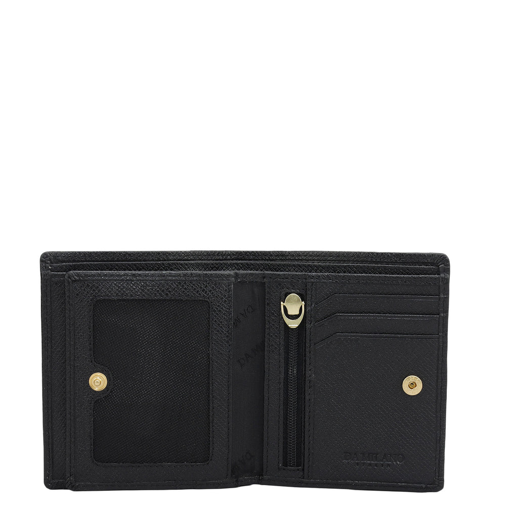 Crafted from textured leather, Da Milano men's bifold wallet offers a compact yet stylish design. Featuring easy-to-organize compartments, card slots, and pockets, it combines practicality with elegance. Subtle branding on the front enhances its refined appearance.
