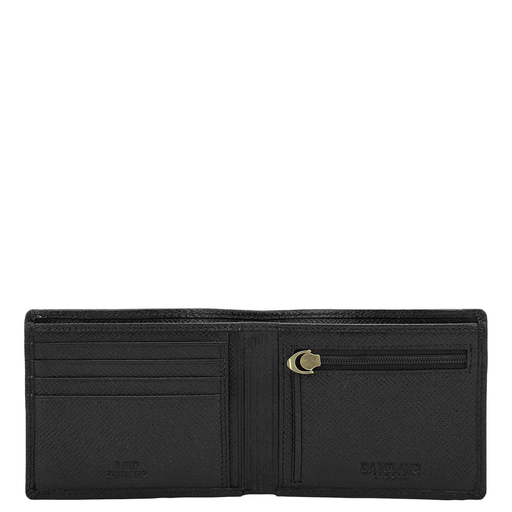 Crafted from textured leather, Da Milano men's bifold wallet offers a compact yet stylish design. Featuring easy-to-organize compartments, card slots, and pockets, it combines practicality with elegance. Subtle branding on the front enhances its refined appearance.