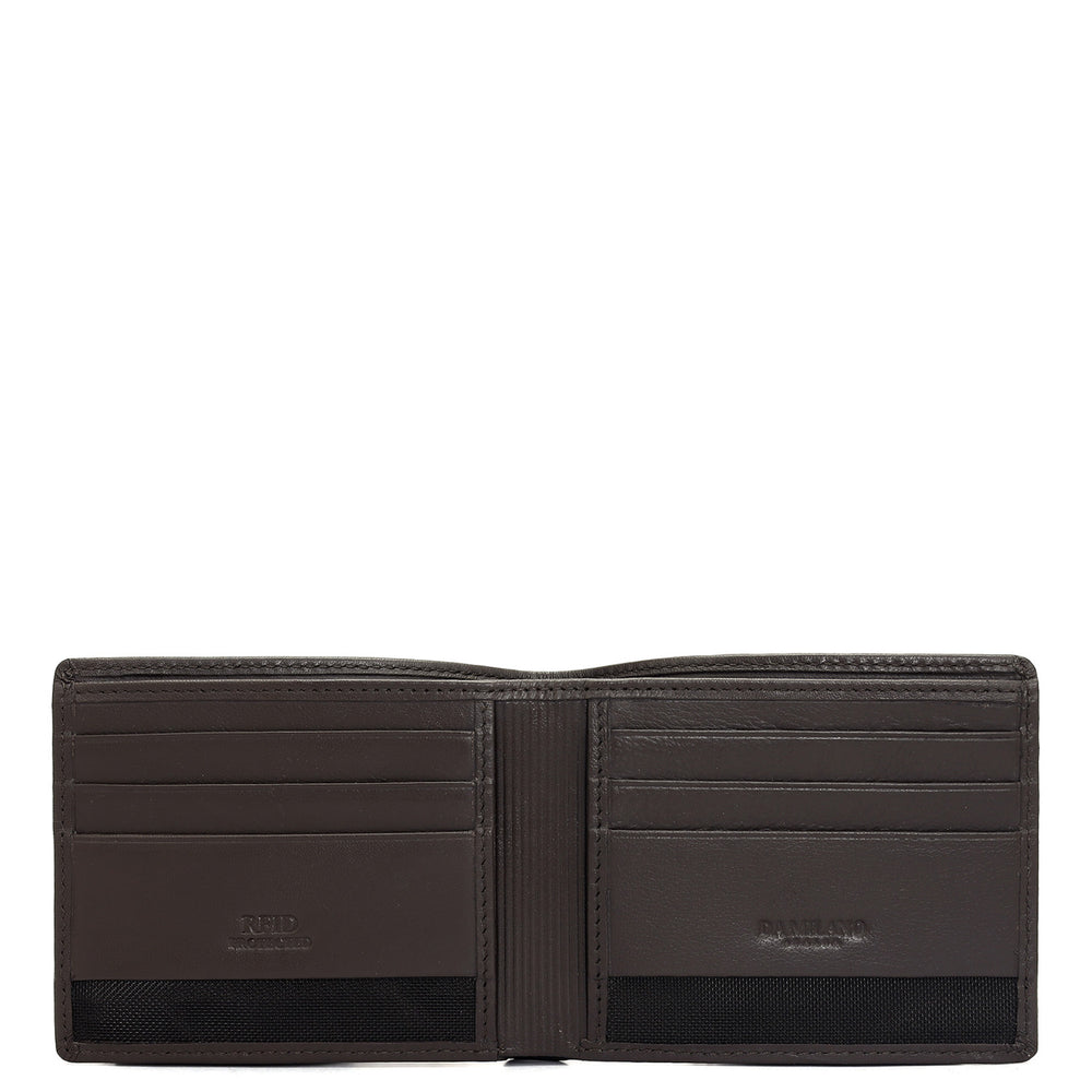 Crafted from textured leather, Da Milano men's bifold wallet offers a compact yet stylish design. Featuring easy-to-organize compartments, card slots, and pockets, it combines practicality with elegance. Subtle branding on the front enhances its refined appearance.