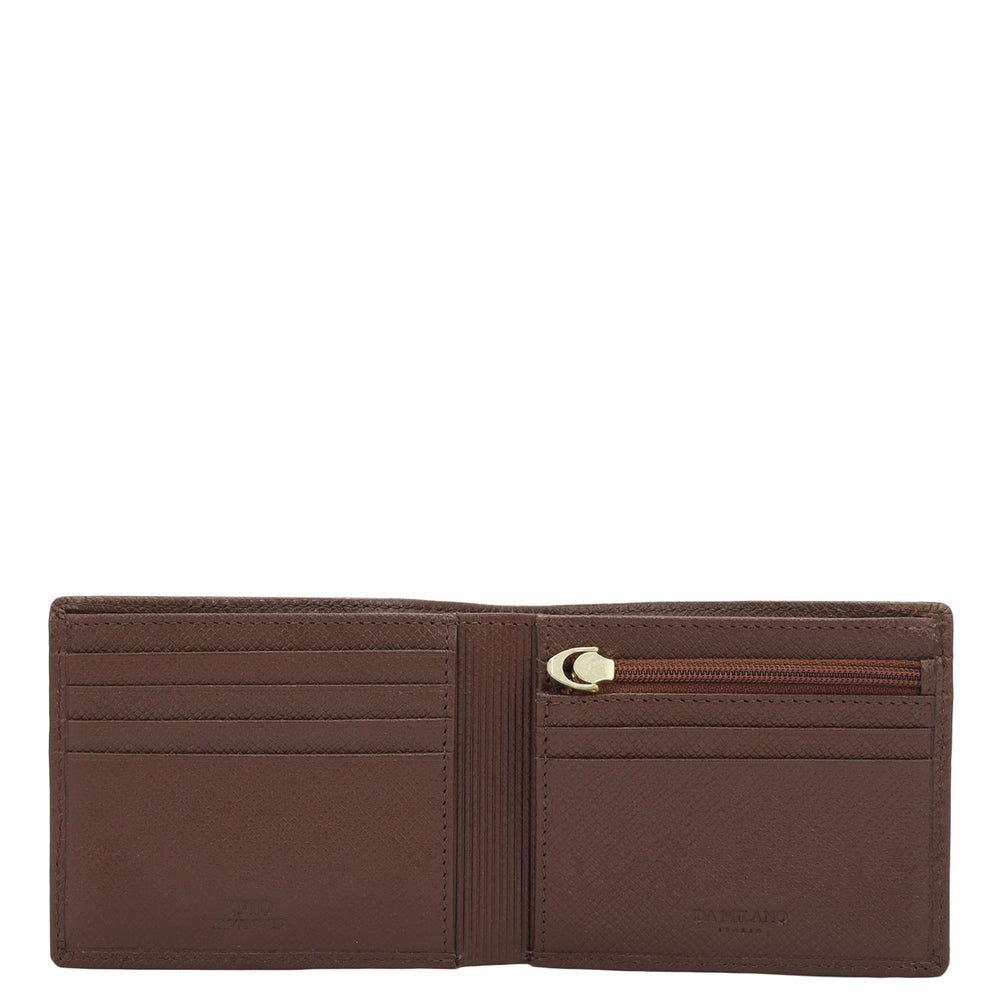 Crafted from textured leather, Da Milano men's bifold wallet offers a compact yet stylish design. Featuring easy-to-organize compartments, card slots, and pockets, it combines practicality with elegance. Subtle branding on the front enhances its refined appearance.