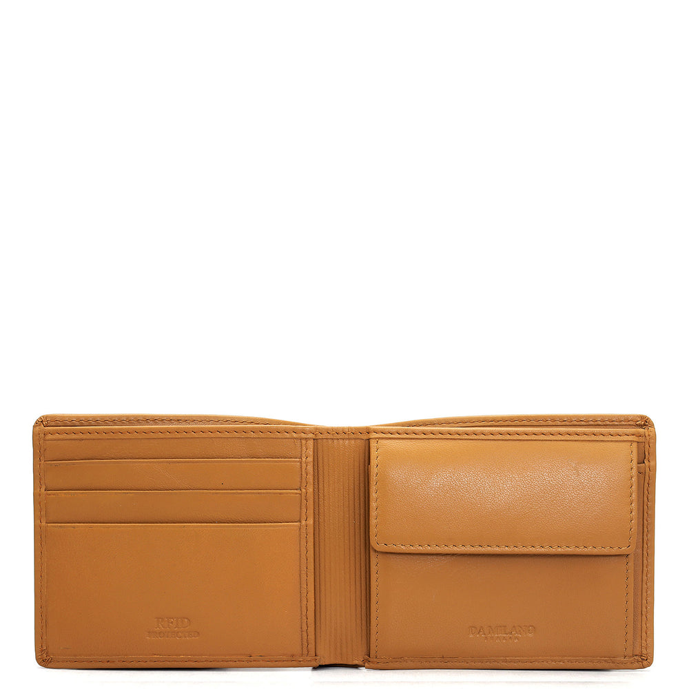 Crafted from textured leather, Da Milano men's bifold wallet offers a compact yet stylish design. Featuring easy-to-organize compartments, card slots, and pockets, it combines practicality with elegance. Subtle branding on the front enhances its refined appearance.