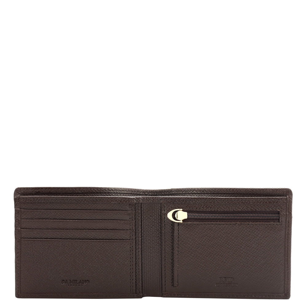 Crafted from textured leather, Da Milano men's bifold wallet offers a compact yet stylish design. Featuring easy-to-organize compartments, card slots, and pockets, it combines practicality with elegance. Subtle branding on the front enhances its refined appearance.