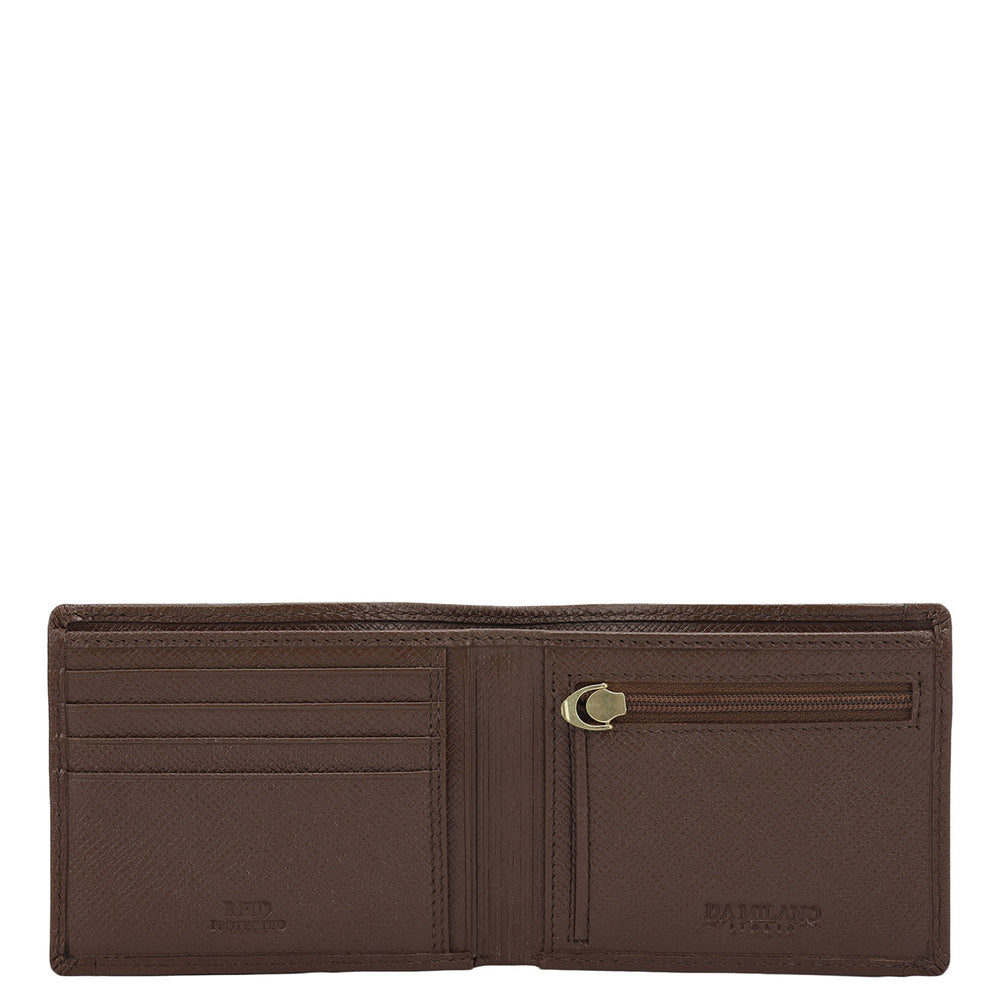 Crafted from textured leather, Da Milano men's bifold wallet offers a compact yet stylish design. Featuring easy-to-organize compartments, card slots, and pockets, it combines practicality with elegance. Subtle branding on the front enhances its refined appearance.