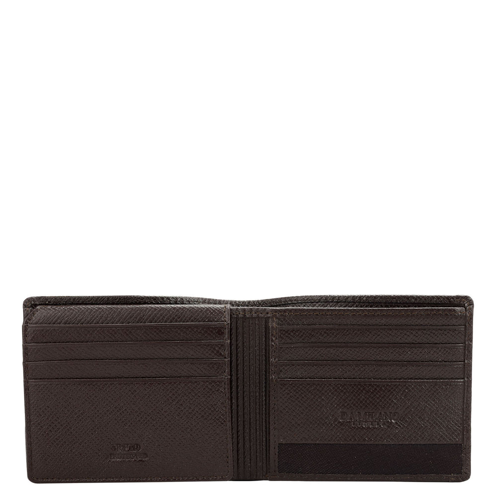 Crafted from textured leather, Da Milano men's bifold wallet offers a compact yet stylish design. Featuring easy-to-organize compartments, card slots, and pockets, it combines practicality with elegance. Subtle branding on the front enhances its refined appearance.