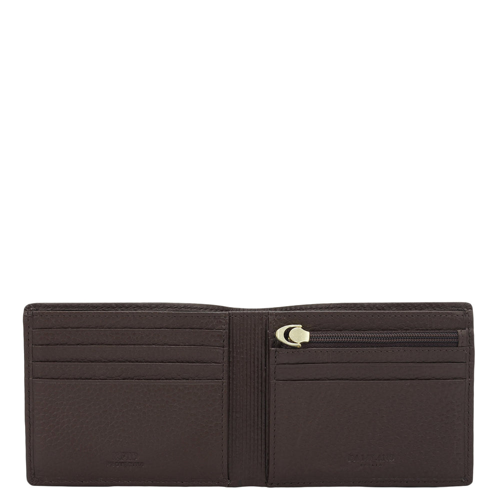 Crafted from textured leather, Da Milano men's bifold wallet offers a compact yet stylish design. Featuring easy-to-organize compartments, card slots, and pockets, it combines practicality with elegance. Subtle branding on the front enhances its refined appearance.