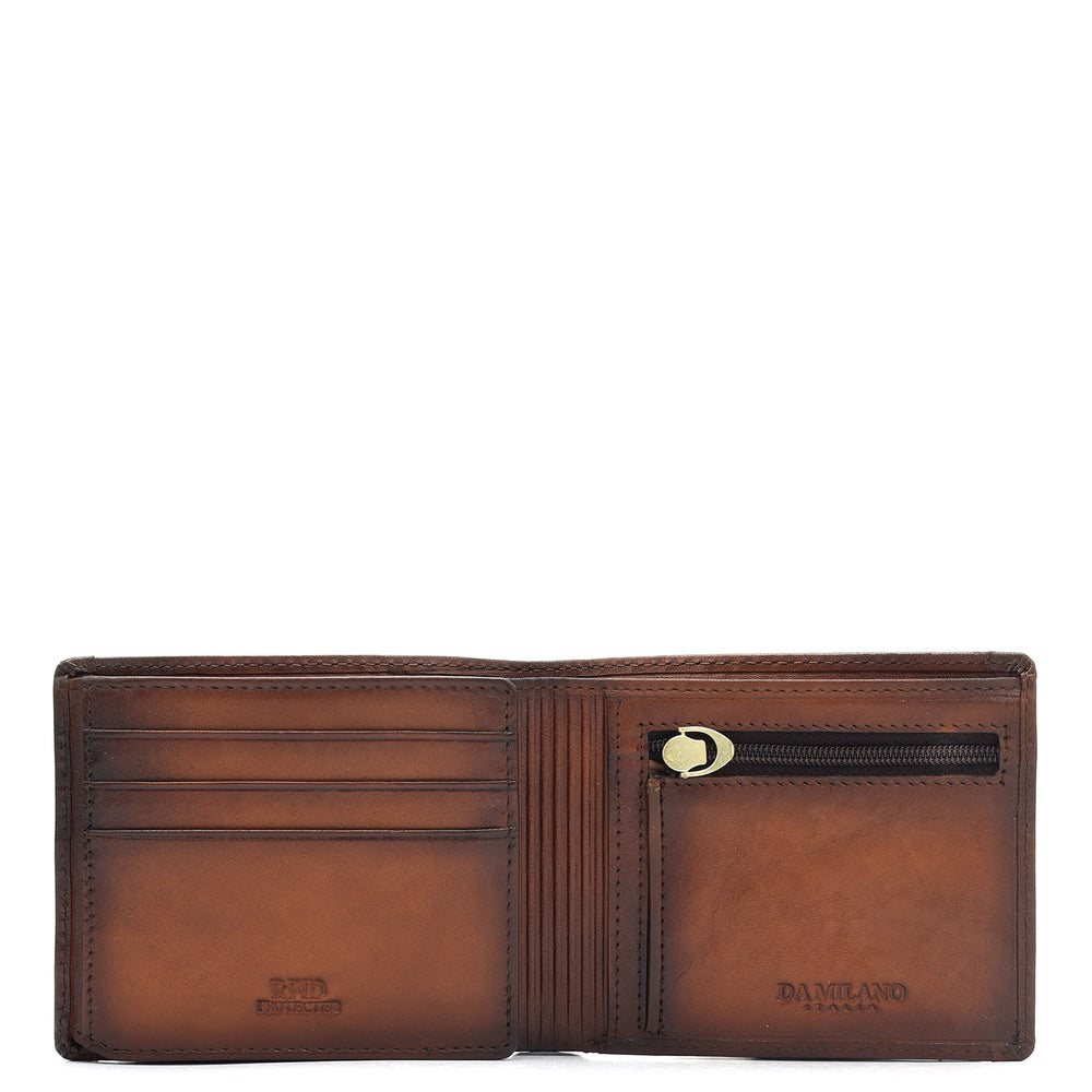 Crafted from textured leather, Da Milano men's bifold wallet (insert the sub category as per the product here) offers a compact yet stylish design. Featuring easy-to-organize compartments, card slots, and pockets, it combines practicality with elegance. Subtle branding on the front enhances its refined appearance.