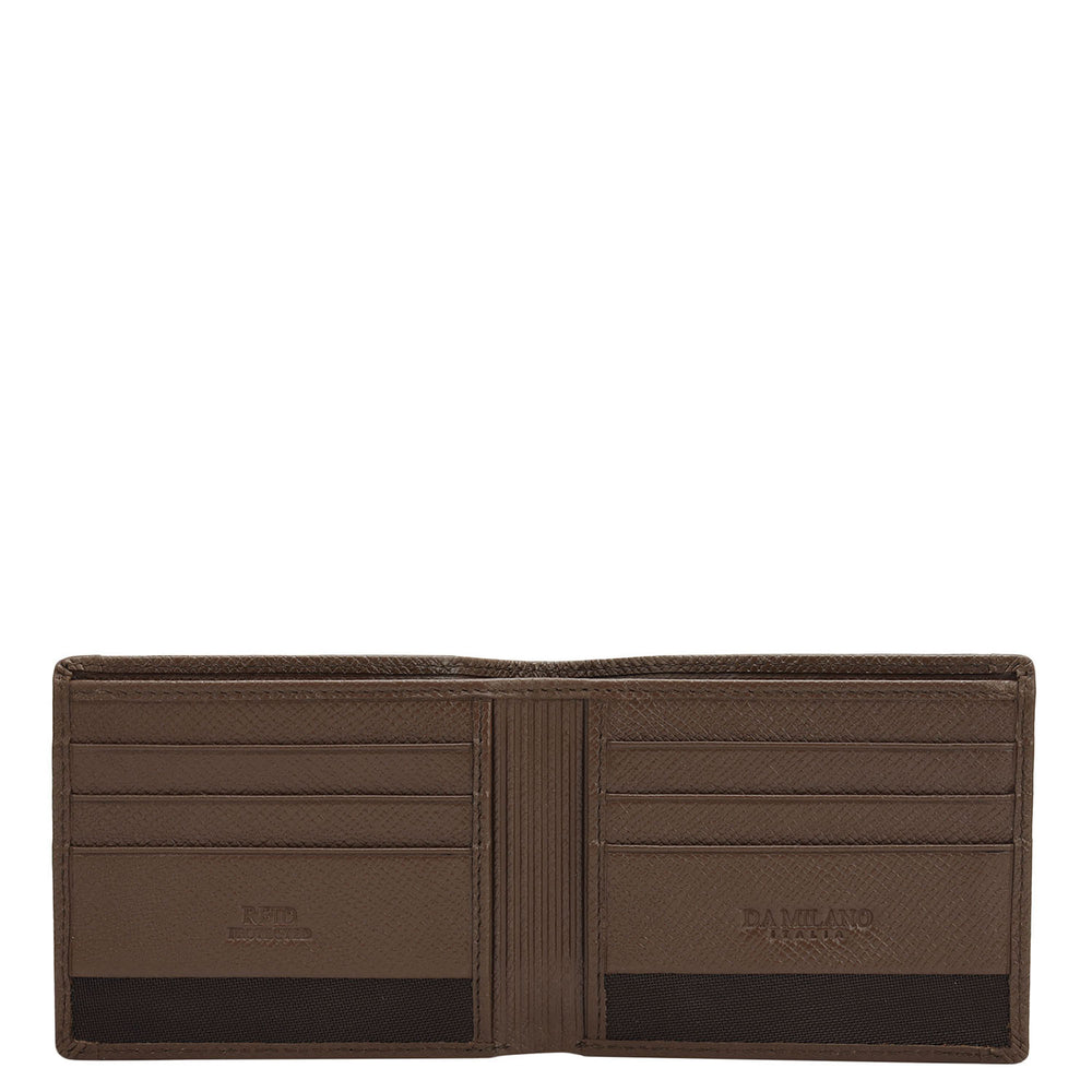 Crafted from textured leather, Da Milano men's bifold wallet offers a compact yet stylish design. Featuring easy-to-organize compartments, card slots, and pockets, it combines practicality with elegance. Subtle branding on the front enhances its refined appearance.