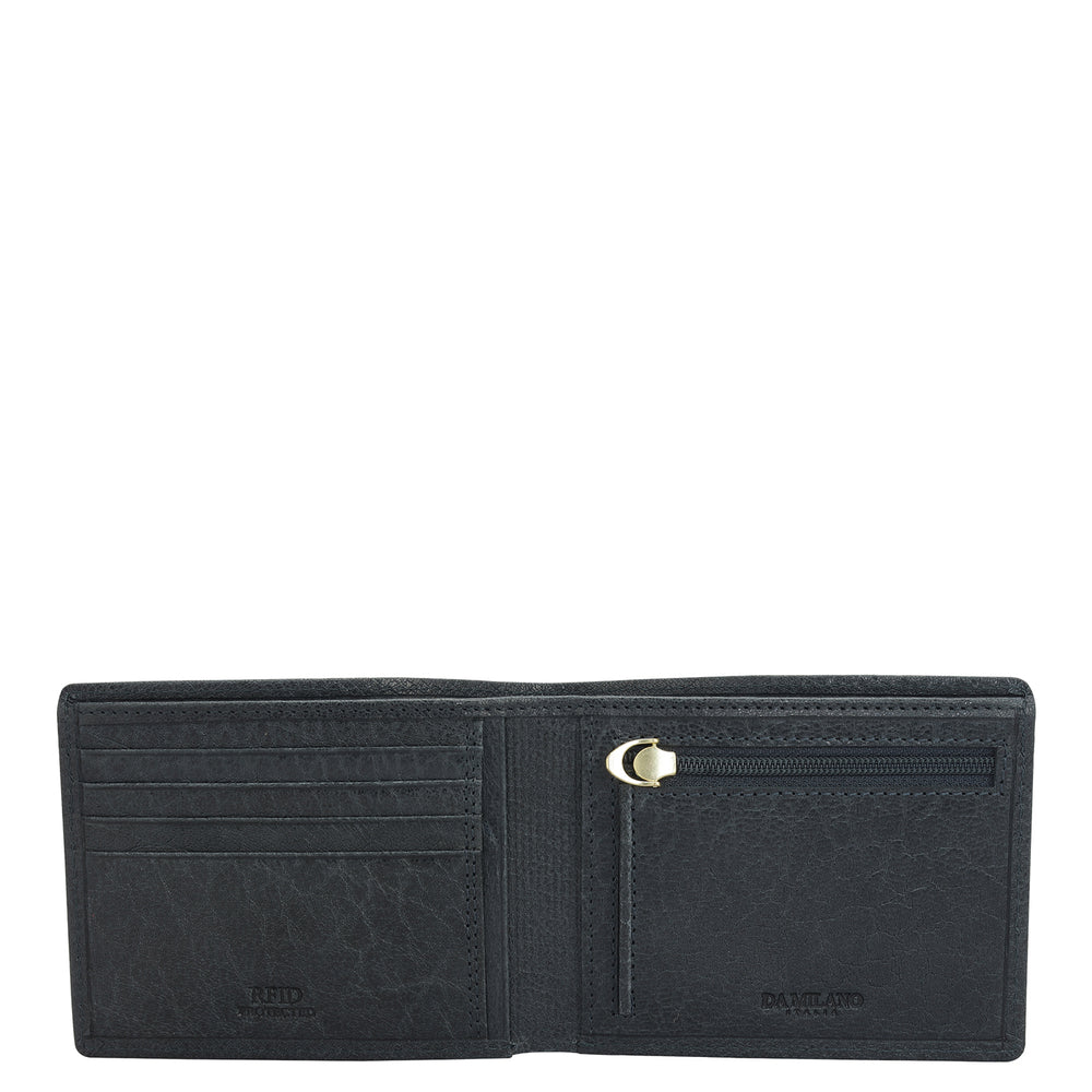 Crafted from textured leather, Da Milano men's bifold wallet offers a compact yet stylish design. Featuring easy-to-organize compartments, card slots, and pockets, it combines practicality with elegance. Subtle branding on the front enhances its refined appearance.