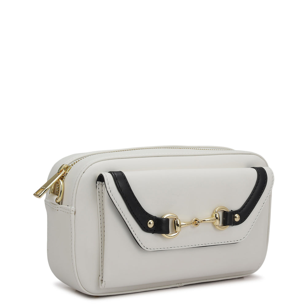 Minimal yet refined, the Classic Leather Sling Bag in Snow White is a perfect blend of clean design and thoughtful functionality. Crafted in smooth, plain genuine leather, it offers a timeless look enhanced by sleek black accents and polished gold-tone hardware.