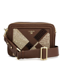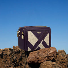 A striking fusion of texture and tone, this compact sling is crafted in croco-embossed leather with a luxe Franzy finish. The geometric patchwork in contrasting Plumberry and Frost hues adds a bold yet elegant character. Designed for day-to-evening ease, it features dual compartments and gold-tone accents—elevating every ensemble with artful precision.
