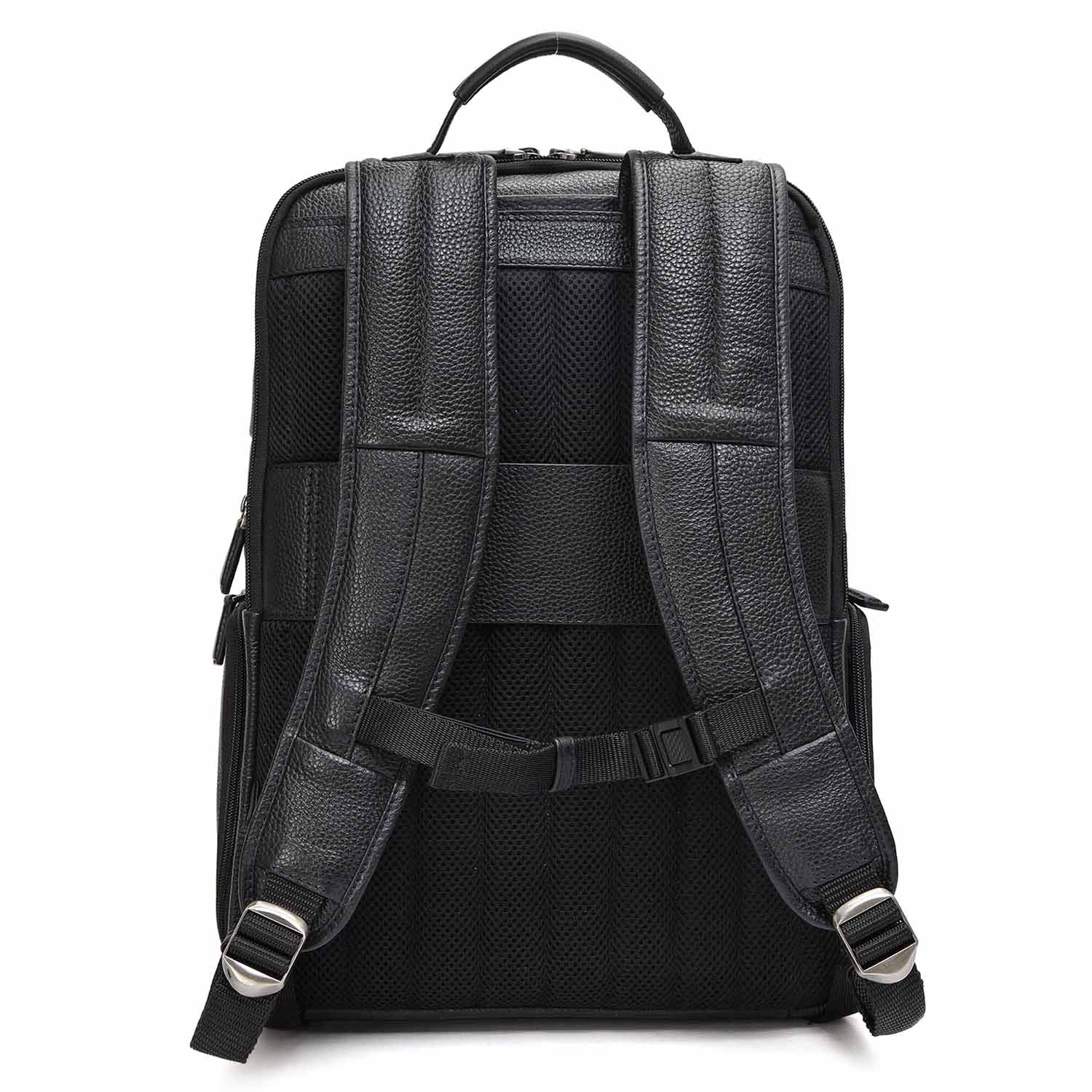 Leather backpack with a play of texture. Featuring multipurpose pockets on the exterior as well as interior to enhance utility. This functional bag is the perfect fusion of Italian craftsmanship and contemporary style. This bag can fit a standard laptop up to 15 inches.