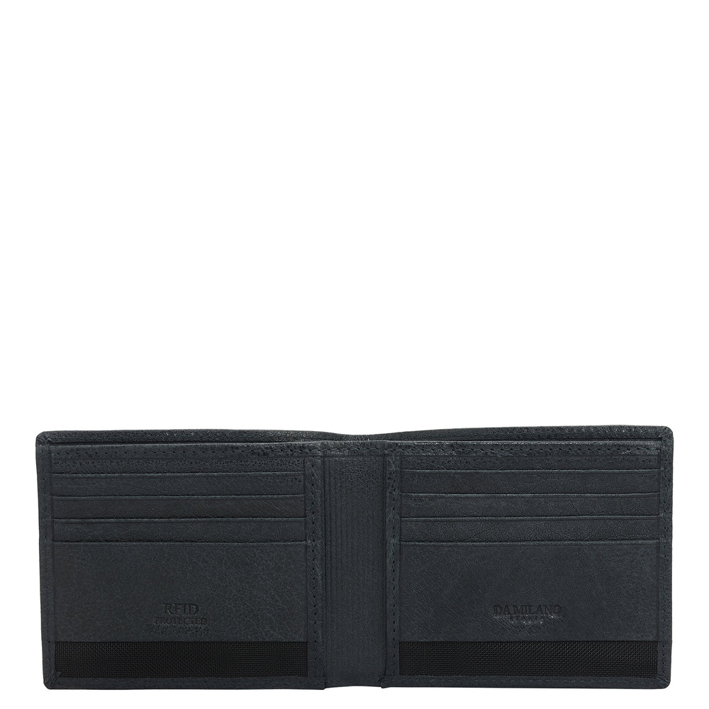 Crafted from textured leather, Da Milano men's bifold wallet offers a compact yet stylish design. Featuring easy-to-organize compartments, card slots, and pockets, it combines practicality with elegance. Subtle branding on the front enhances its refined appearance.