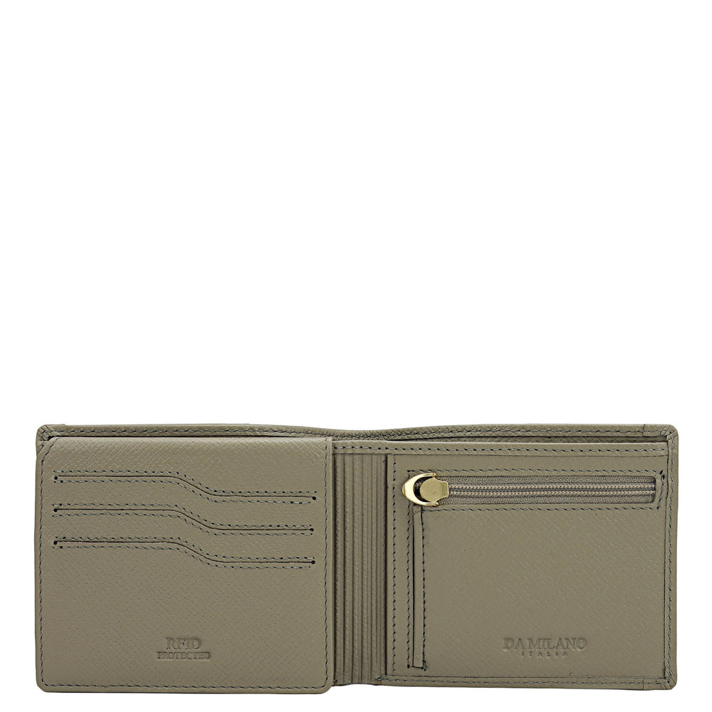 Crafted from textured leather, Da Milano men's bifold wallet offers a compact yet stylish design. Featuring easy-to-organize compartments, card slots, and pockets, it combines practicality with elegance. Subtle branding on the front enhances its refined appearance.