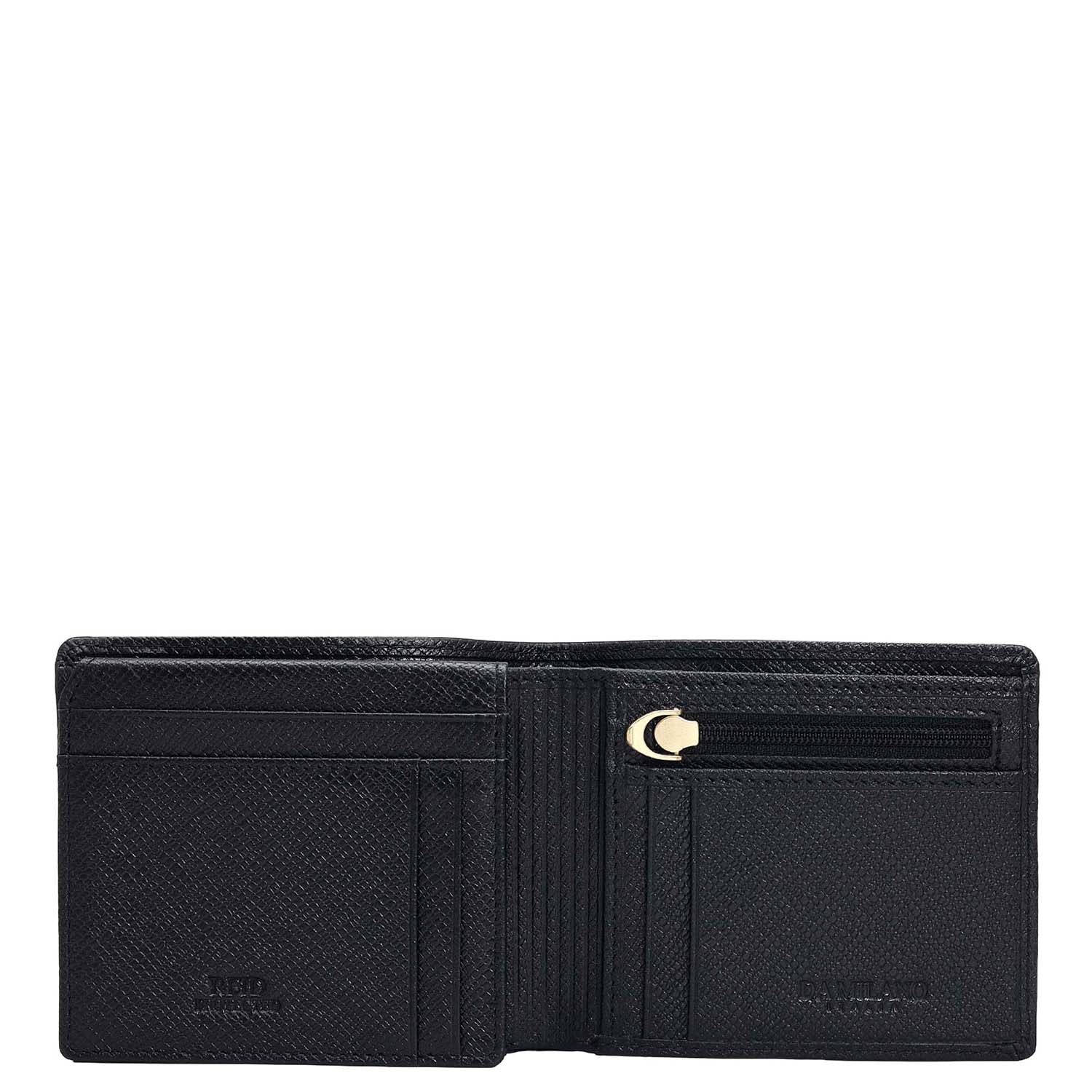 Crafted from textured leather, Da Milano men's bifold wallet offers a compact yet stylish design. Featuring easy-to-organize compartments, card slots, and pockets, it combines practicality with elegance. Subtle branding on the front enhances its refined appearance.