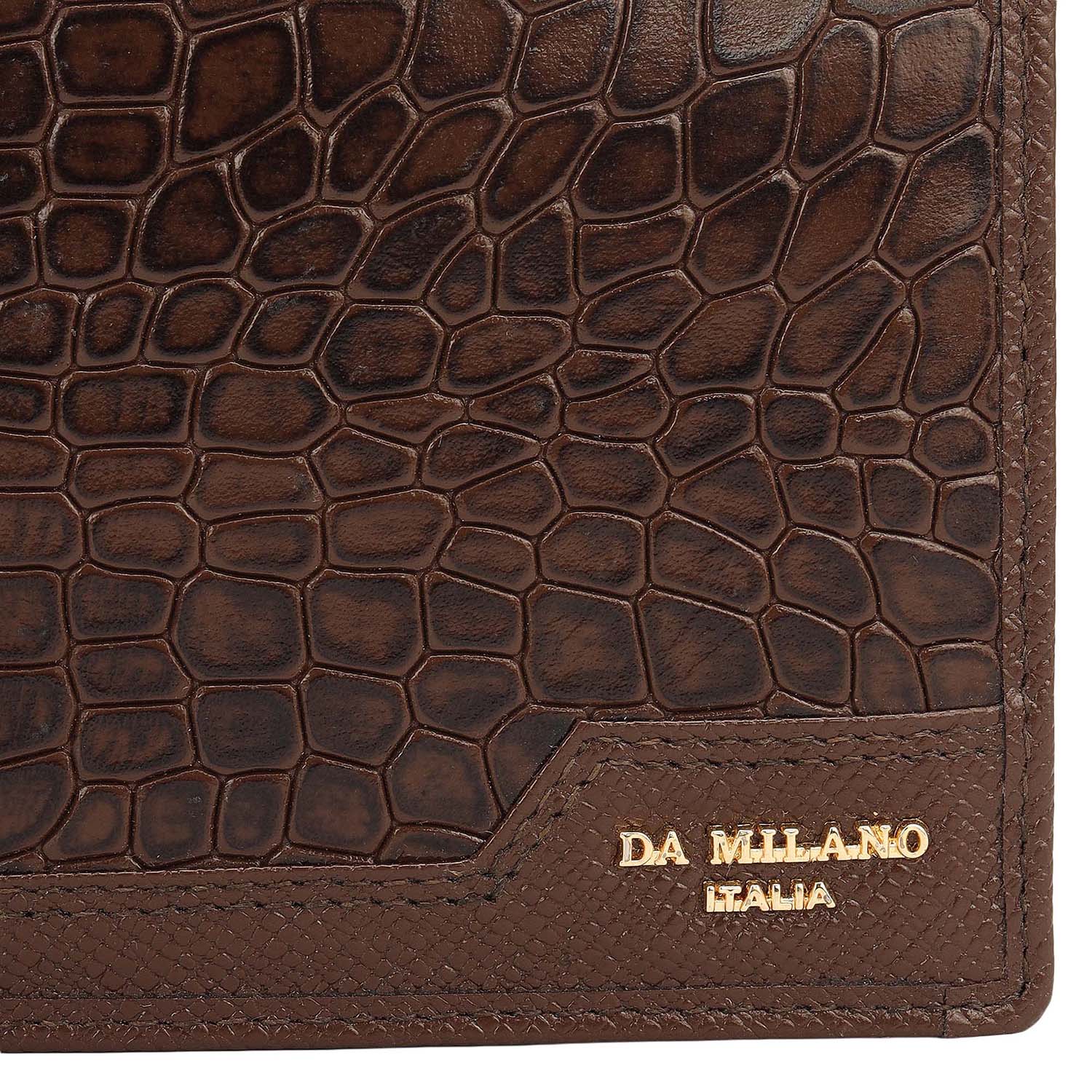 Crafted from textured leather, Da Milano men's bifold wallet offers a compact yet stylish design. Featuring easy-to-organize compartments, card slots, and pockets, it combines practicality with elegance. Subtle branding on the front enhances its refined appearance.