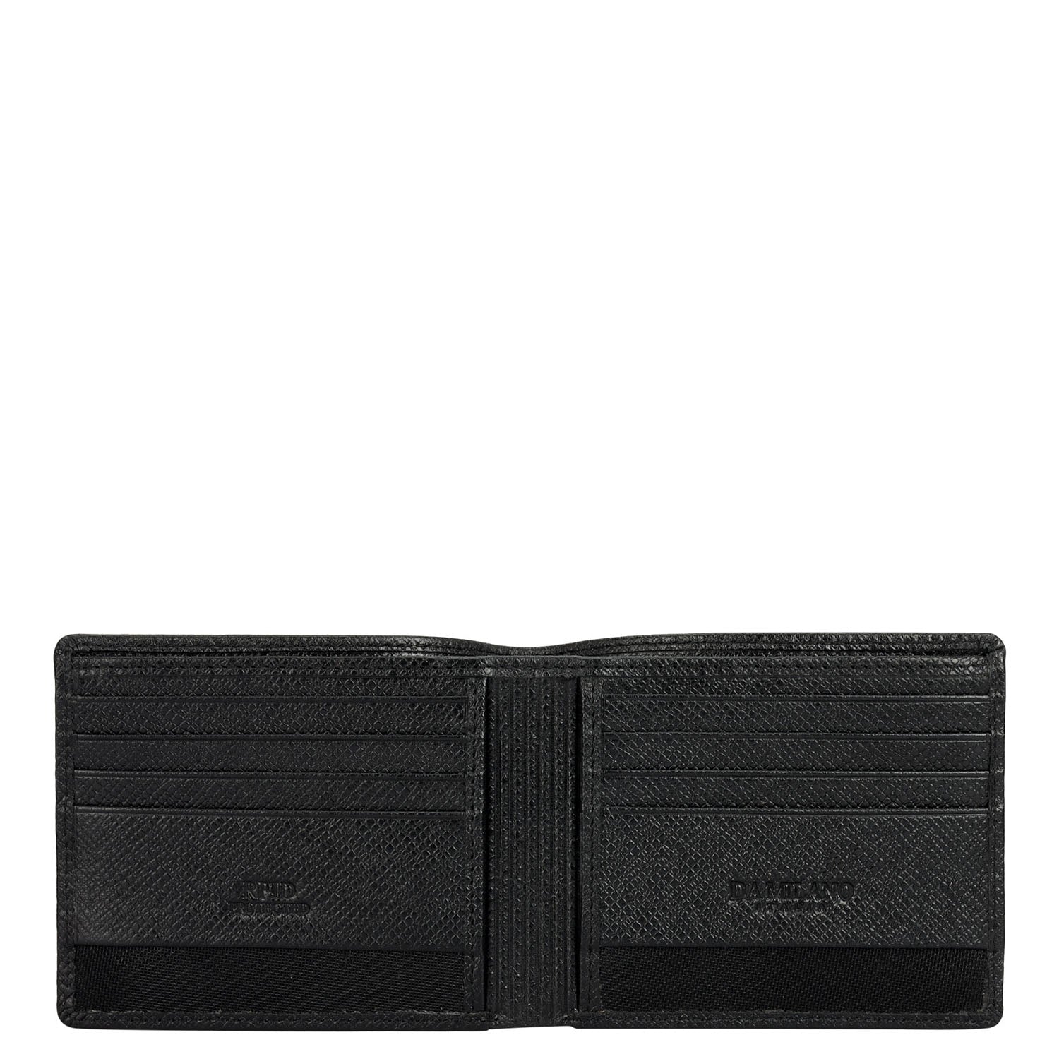 Crafted from textured leather, Da Milano men's bifold wallet offers a compact yet stylish design. Featuring easy-to-organize compartments, card slots, and pockets, it combines practicality with elegance. Subtle branding on the front enhances its refined appearance.