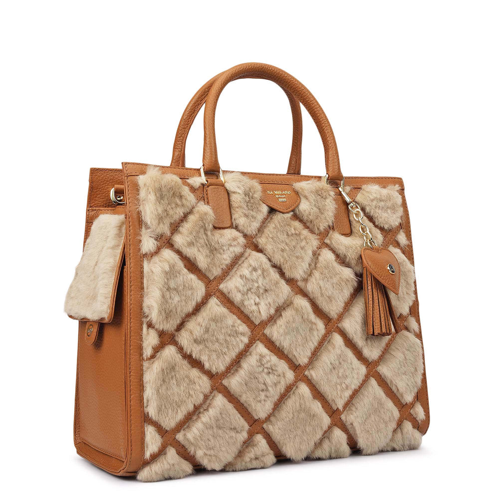 Medium Fur Wax Leather Book Tote - Beige & Cognac