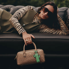 Keep in dust bag when not in use. Clean with soft cloth & leather cream. Avoid exposure to excess heat & water to maintain authentic shine of natural leather.