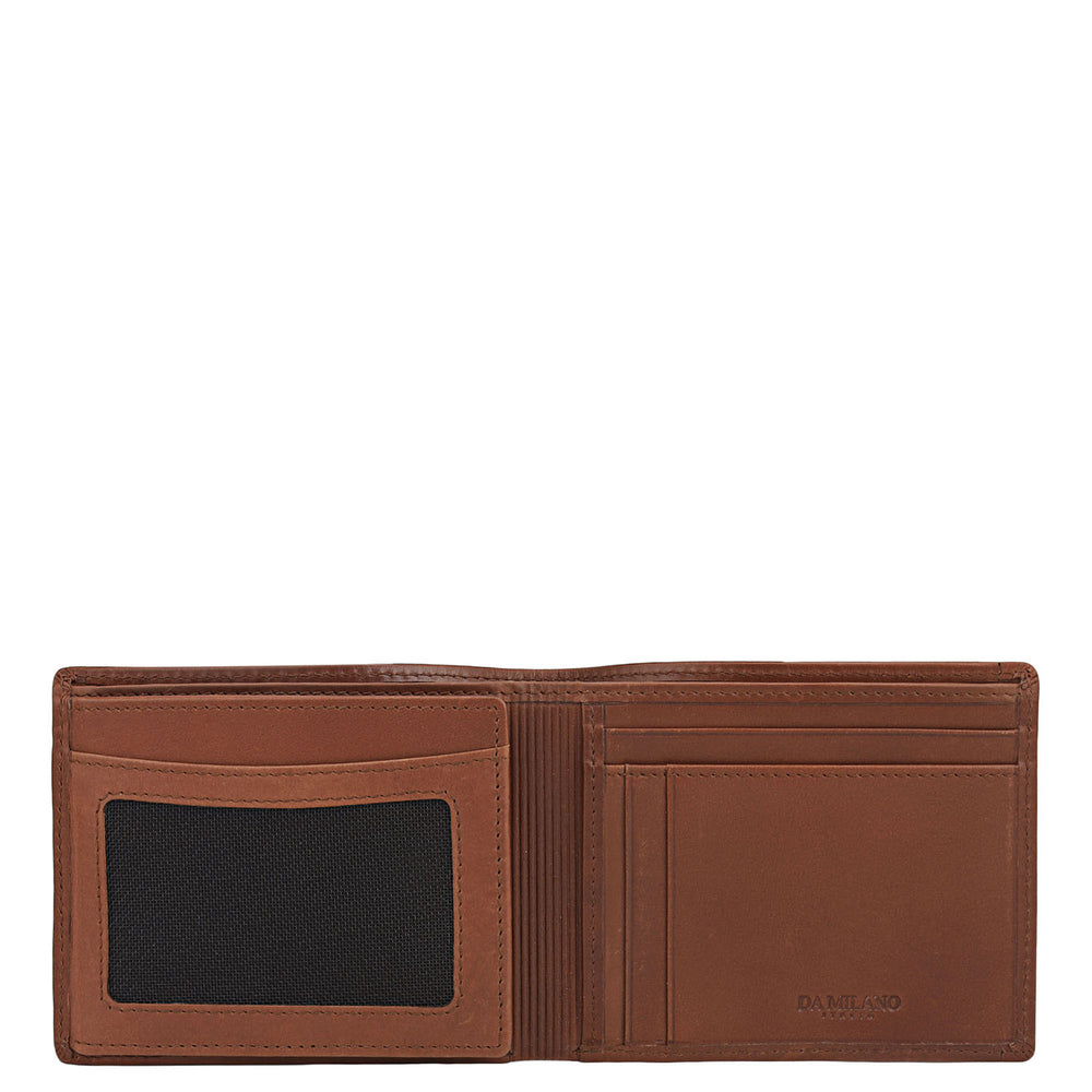 Crafted from textured leather, Da Milano men's bifold wallet offers a compact yet stylish design. Featuring easy-to-organize compartments, card slots, and pockets, it combines practicality with elegance. Subtle branding on the front enhances its refined appearance.