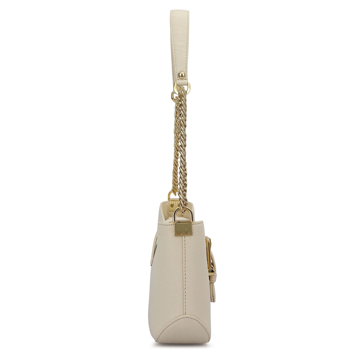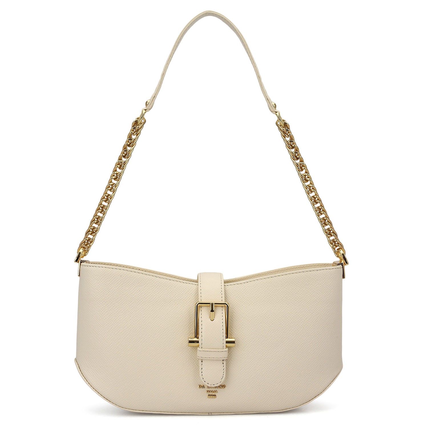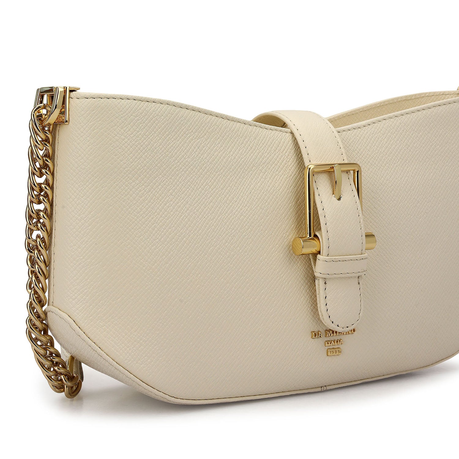 The Online Exclusive Baguette is crafted in a soft marshmallow tone, defined by its sleek curved silhouette and statement buckle detail that adds a contemporary edge.