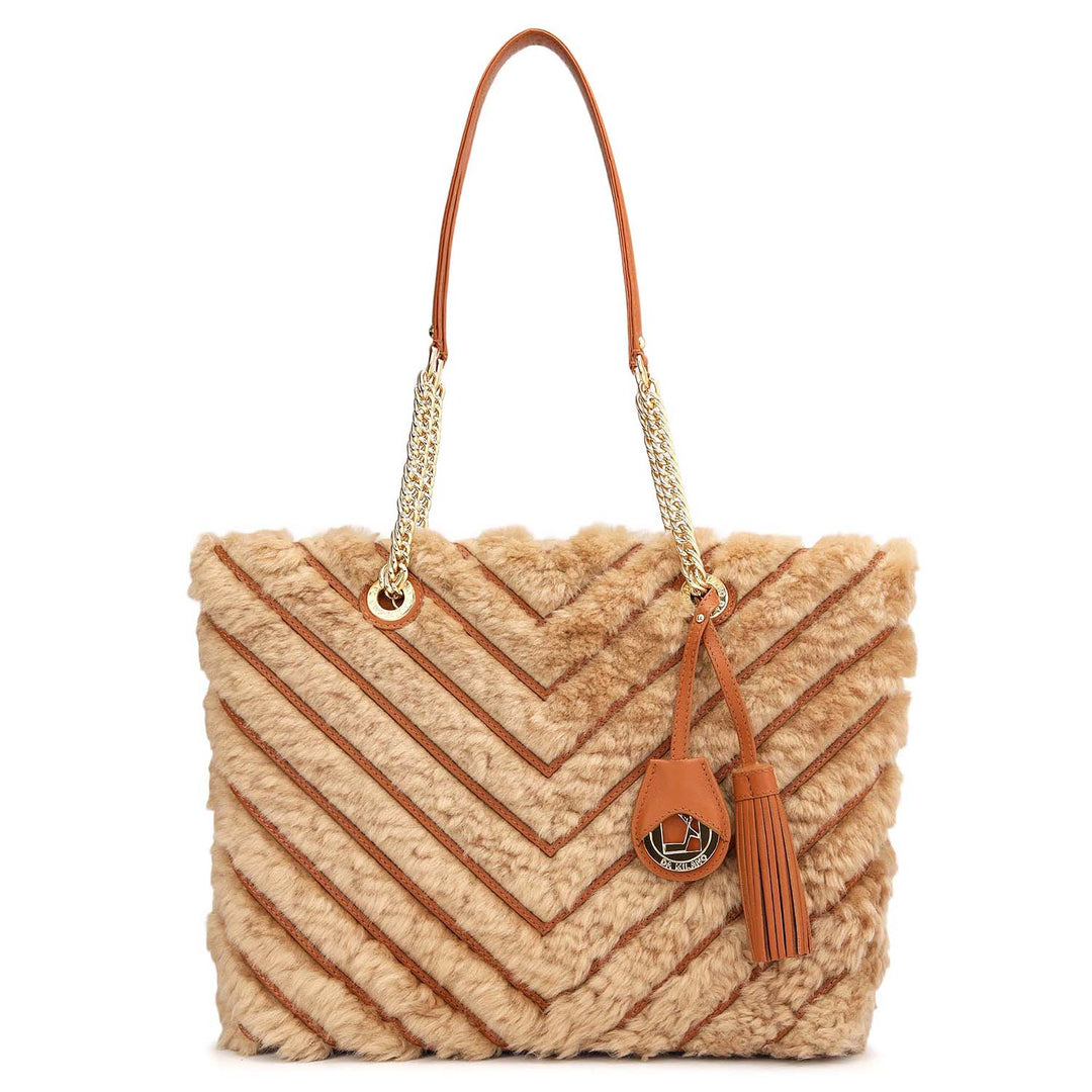 Medium Fur Plain Leather Tote - Beige & Cognac