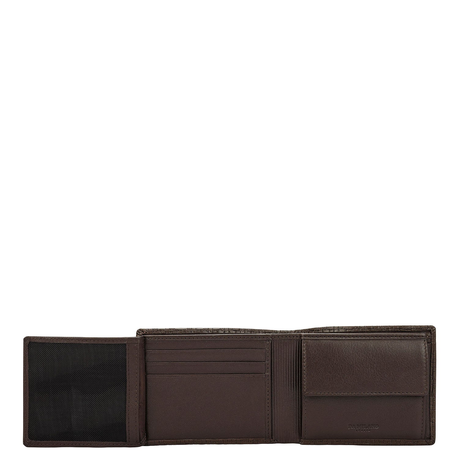 The wallet opens to a well-organised interior featuring two cash compartments, six card slots, two slip pockets, a coin pocket, and an ID window, offering practical storage while maintaining a sleek and compact profile.