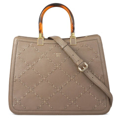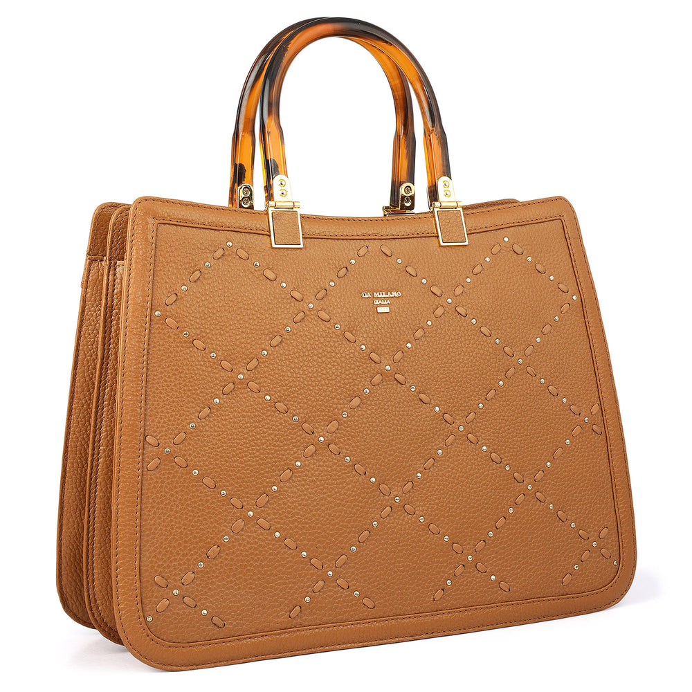 Classic structure meets contemporary detail in this Structured Top Handle Bag. Defined by the collection’s hand-laced diamond pattern and rivet embellishments, this silhouette is elevated further with sleek acrylic handles that add a modern, sculptural touch. The soft wax leather offers rich pebble texture, while the spacious interior and zip-top closure provide practicality for everyday carry. Polished yet distinctive, this tote is designed for those who appreciate craftsmanship with a hint of boldness.