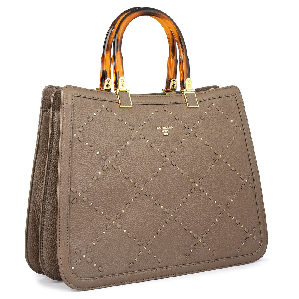 Classic structure meets contemporary detail in this Structured Top Handle Bag. Defined by the collection’s hand-laced diamond pattern and rivet embellishments, this silhouette is elevated further with sleek acrylic handles that add a modern, sculptural touch. The soft wax leather offers rich pebble texture, while the spacious interior and zip-top closure provide practicality for everyday carry. Polished yet distinctive, this tote is designed for those who appreciate craftsmanship with a hint of boldness.