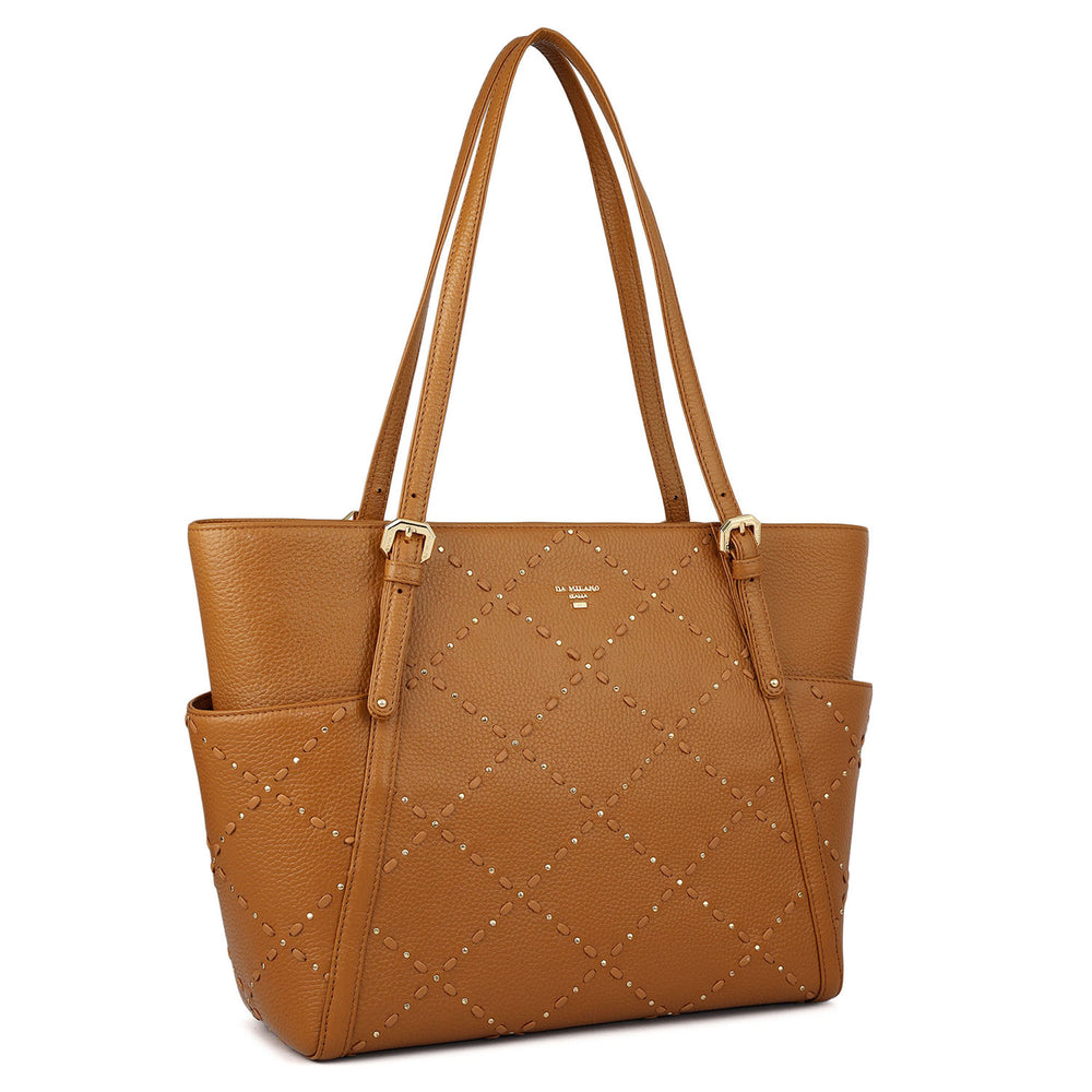 Roomy, refined, and rich in detail, this Shopper is crafted for the woman who carries it all — and carries it well. Featuring the collection’s signature hand-laced diamond pattern with rivet accents, it blends everyday function with artisan finesse. The structured silhouette opens to two spacious compartments, designed to keep essentials sorted with ease. Multiple interior and exterior pockets offer smart storage, while long, adjustable handles ensure all-day comfort. Whether for work, errands, or travel, this Shopper brings handcrafted elegance to your busiest days.