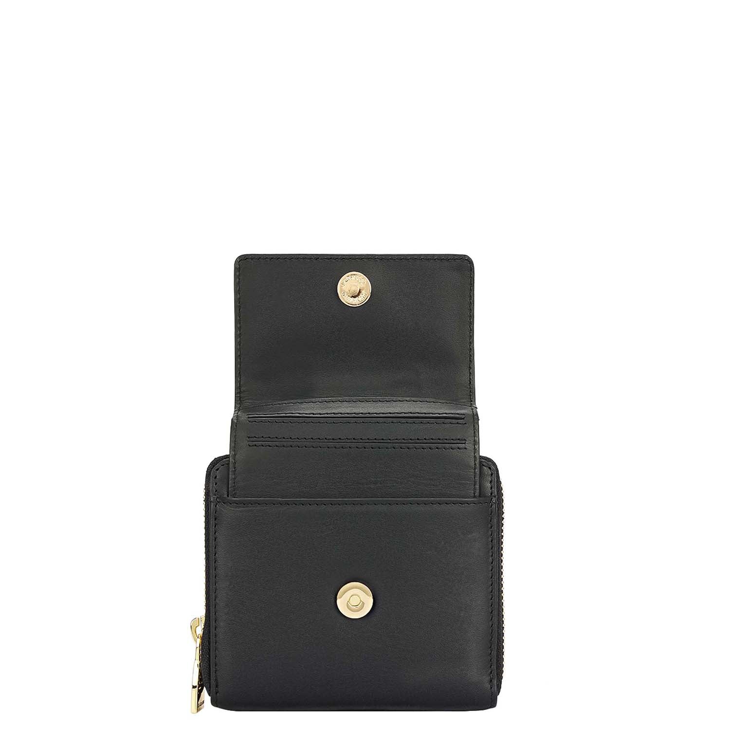 The Prive Compact Wallet is designed in a sleek silhouette with bold panel detailing for a statement finish. Rendered in a classic black tone with contrasting accents and stud embellishments, it brings a modern edge to everyday essentials.