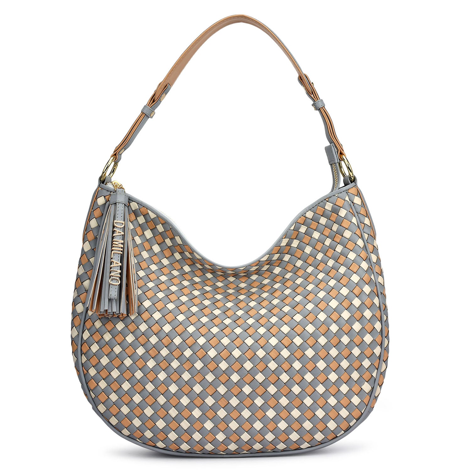 The Tresser Hobo Bag redefines casual carry with the collection’s signature woven detailing and a relaxed, curved silhouette. Crafted in a cool stone-grey tone with a contrasting tri-tone weave, it brings striking texture and a bold finish. Accented with a statement tassel charm, it balances artisanal character with modern ease.