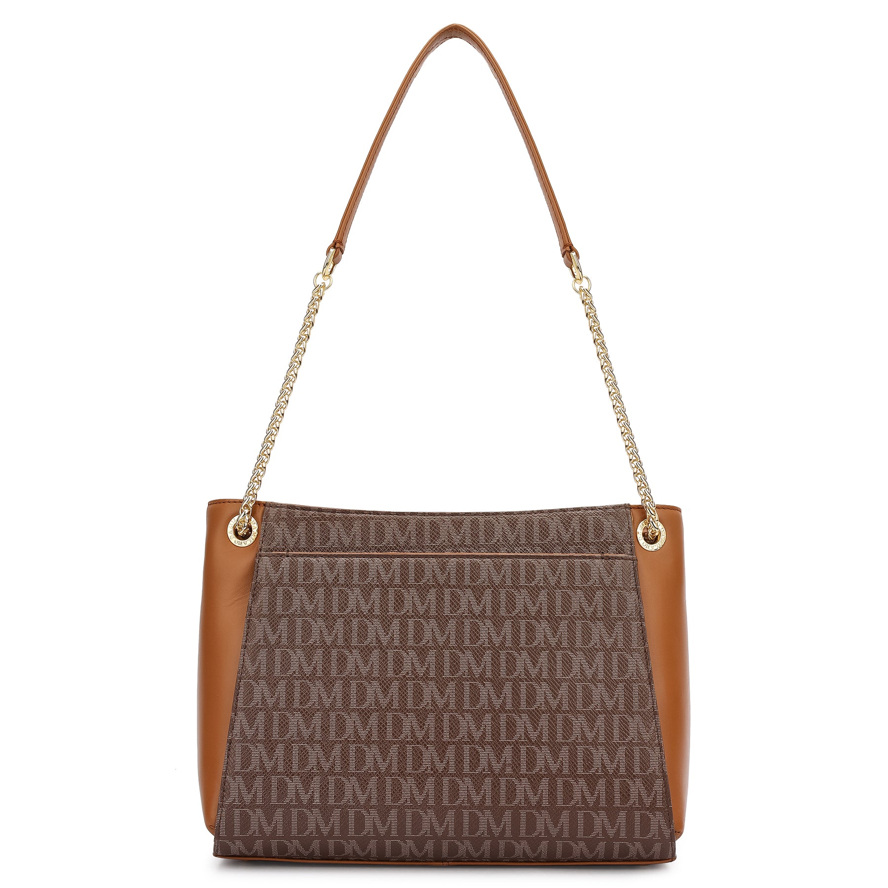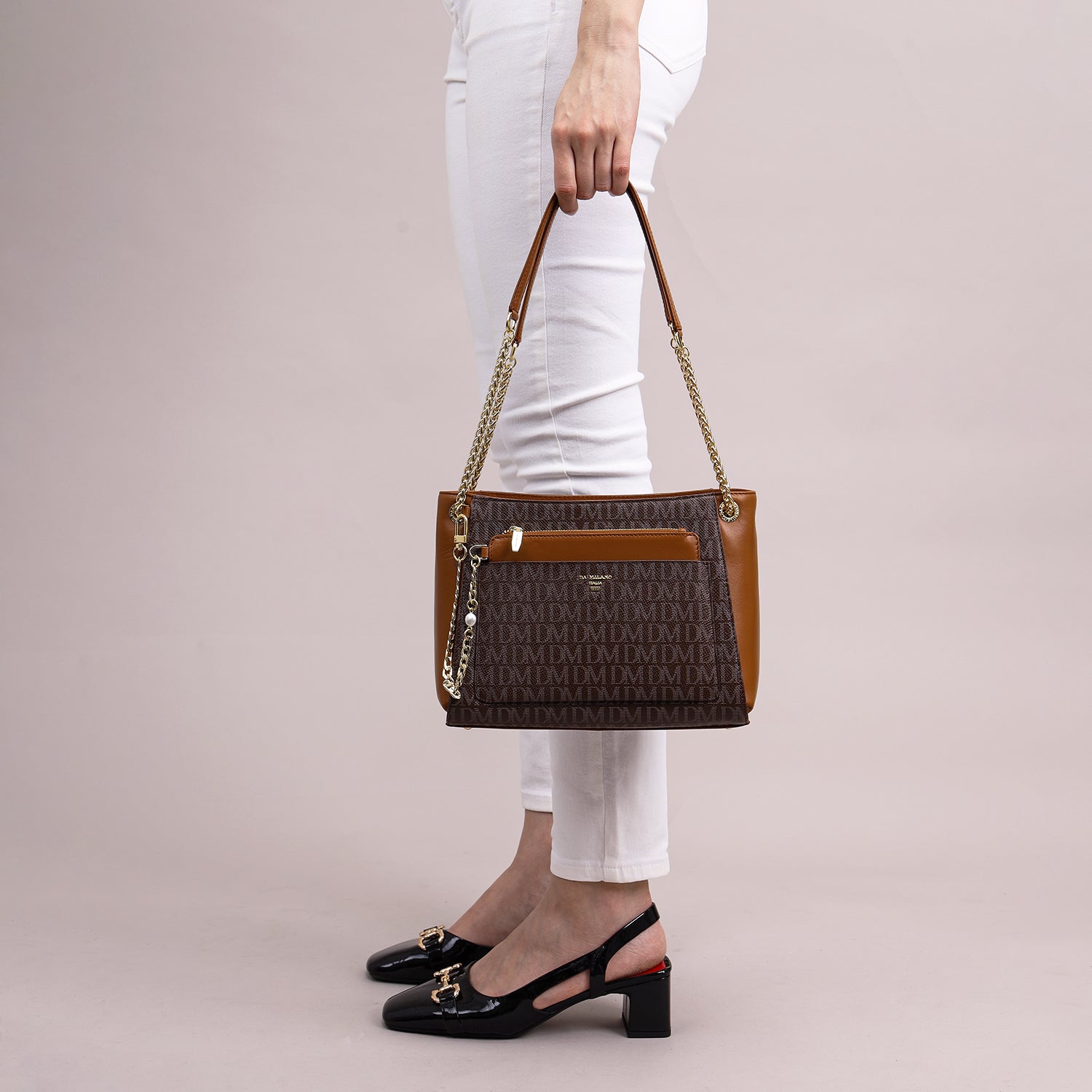 The Monofest Shoulder Bag combines signature monogram detailing with a contemporary silhouette. Crafted in a warm walnut tone, with contrasting caramel side panels. Secured with a zip closure, it opens to a thoughtfully organised interior featuring one main compartment, a zippered pocket, four card slots, and an open pocket for seamless storage. An exterior zip pocket and open pocket provide quick access to essentials, making it ideal for workdays and evening transitions.