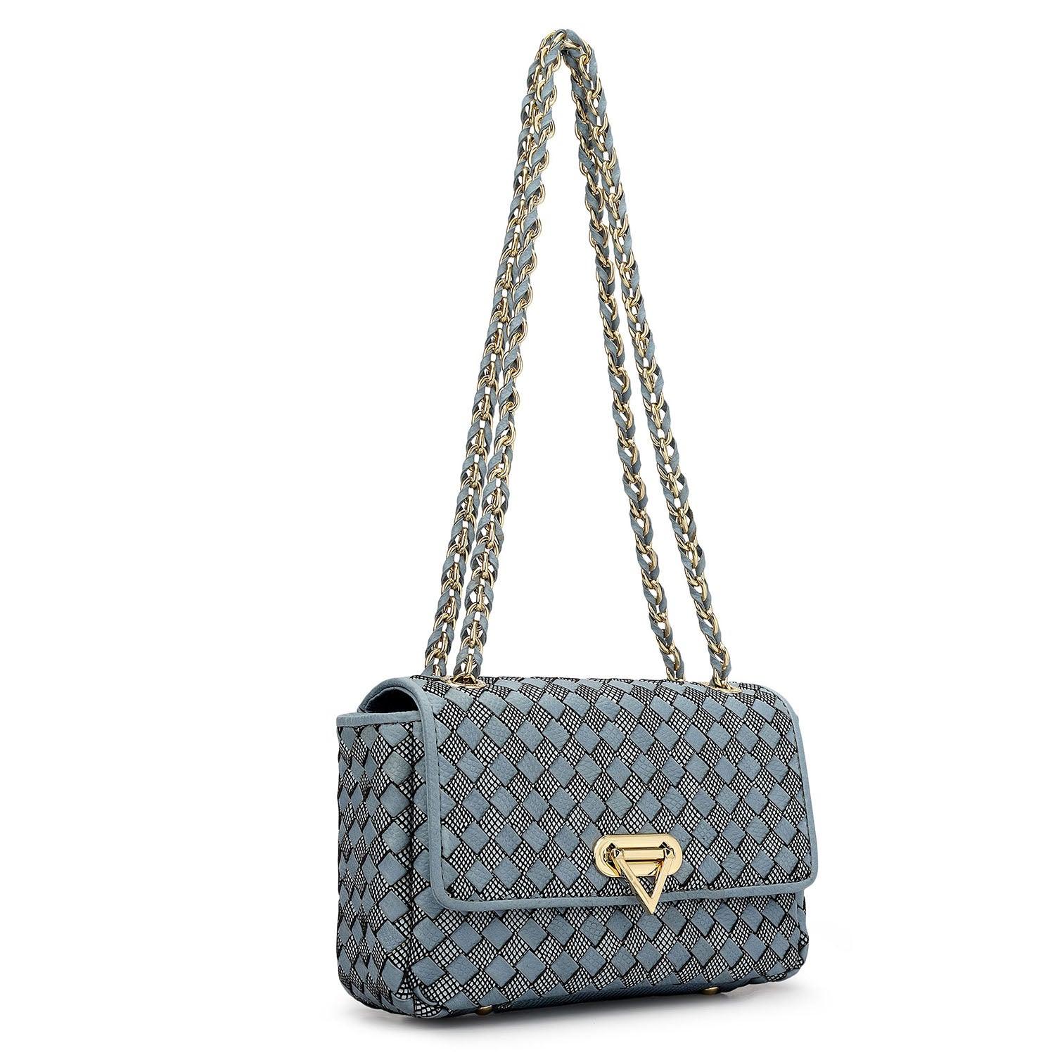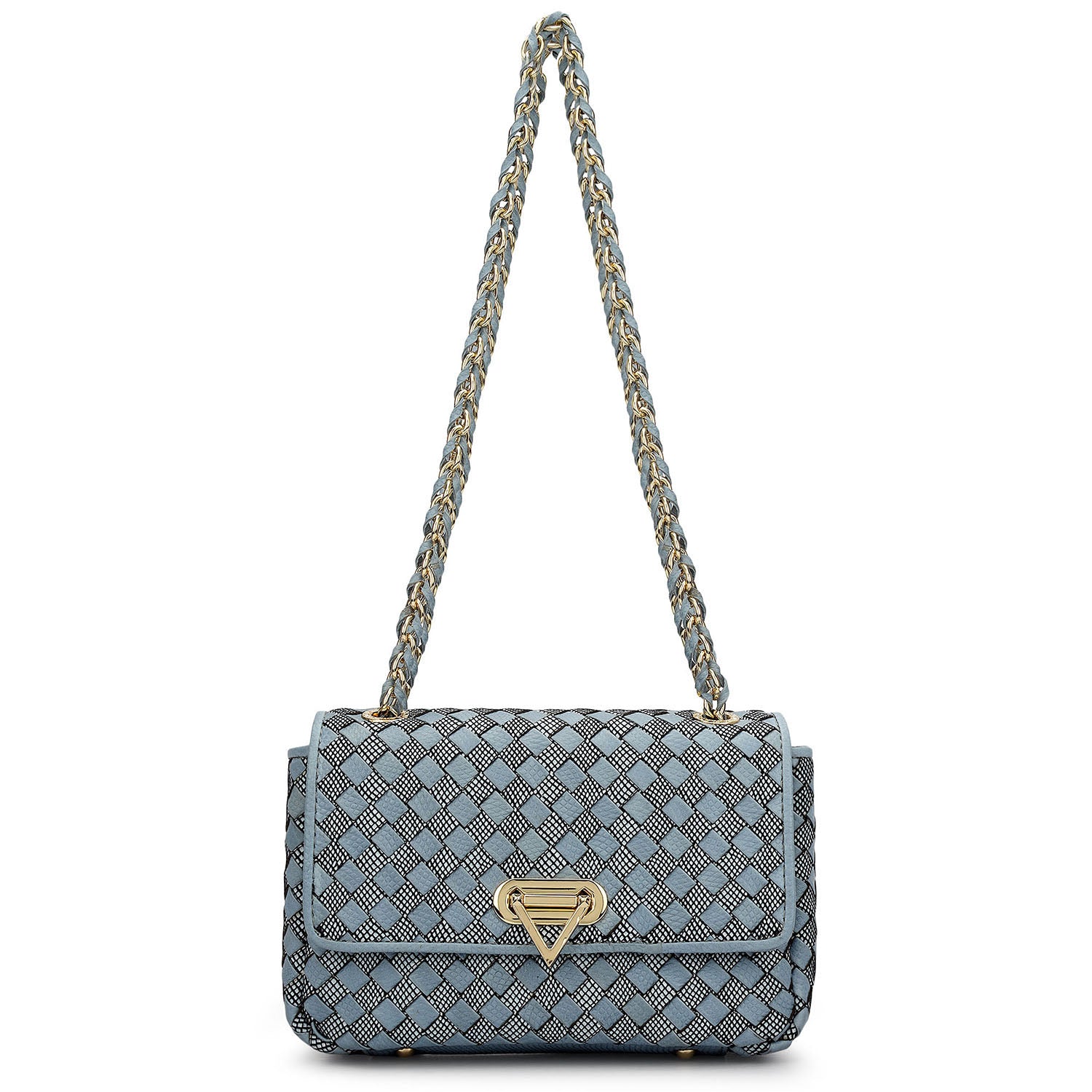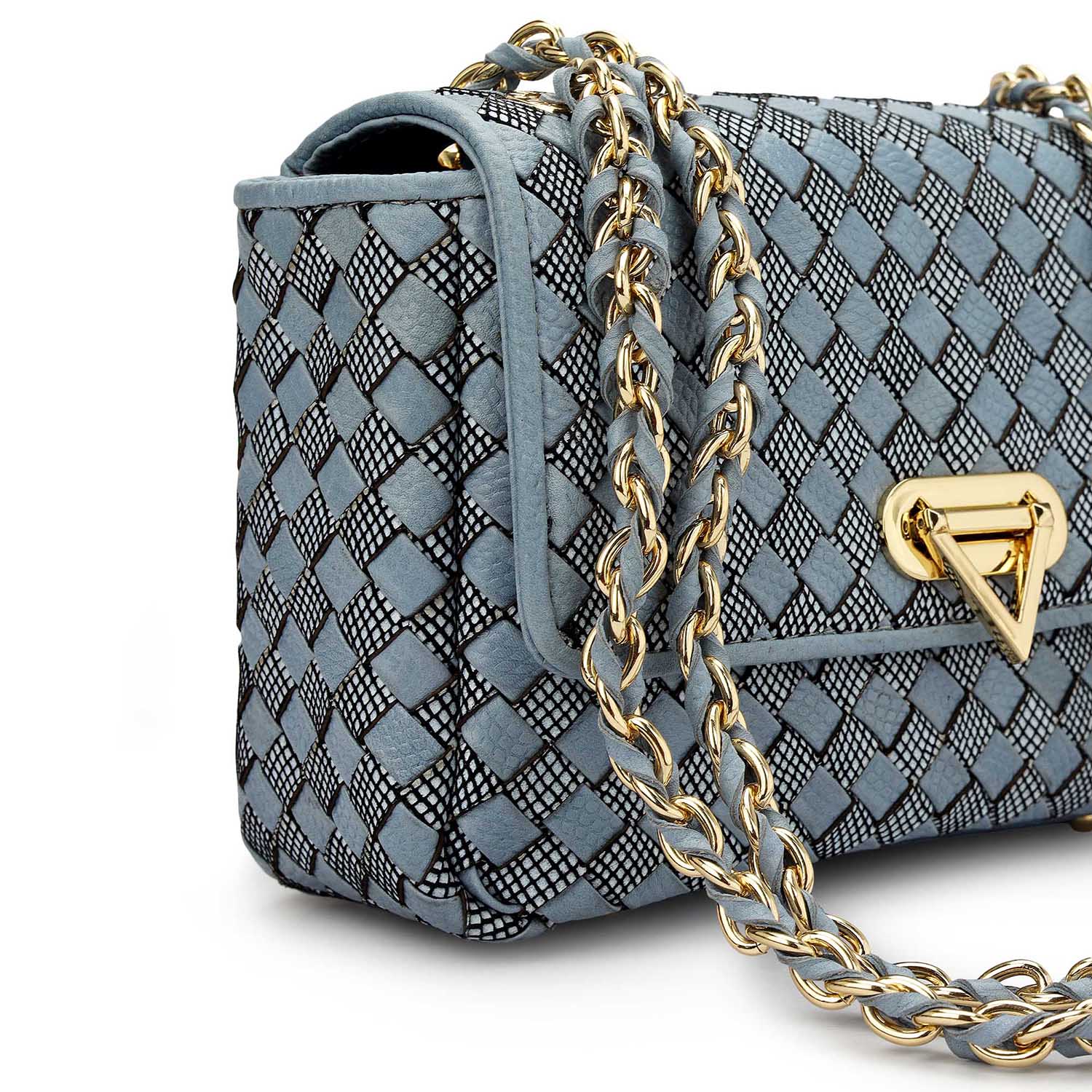 The Tresser Shoulder Bag is upgraded with the collection's signature woven detail layered over a contrasting base, adding depth, texture, and dimension. The soft blue tones mixed with dark mesh accents give it a modern edge, while the leather-threaded gold chain adds movement and shine. It elevates an everyday item with a modern, craft-inspired twist. A statement clasp lock completes the structured silhouette, forming a strong focal point in the design.