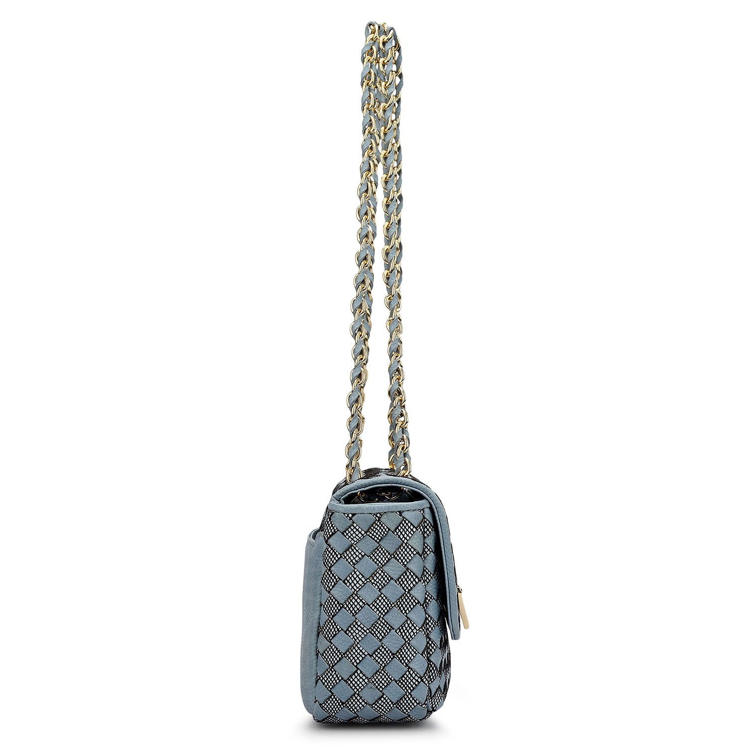 It opens to a thoughtfully arranged interior with two compartments and one zip pocket to keep essentials neatly organised. An exterior slip pocket allows for easy access to on-the-go must-haves, while the chain-accented strap completes the look with a touch of edge and polish.