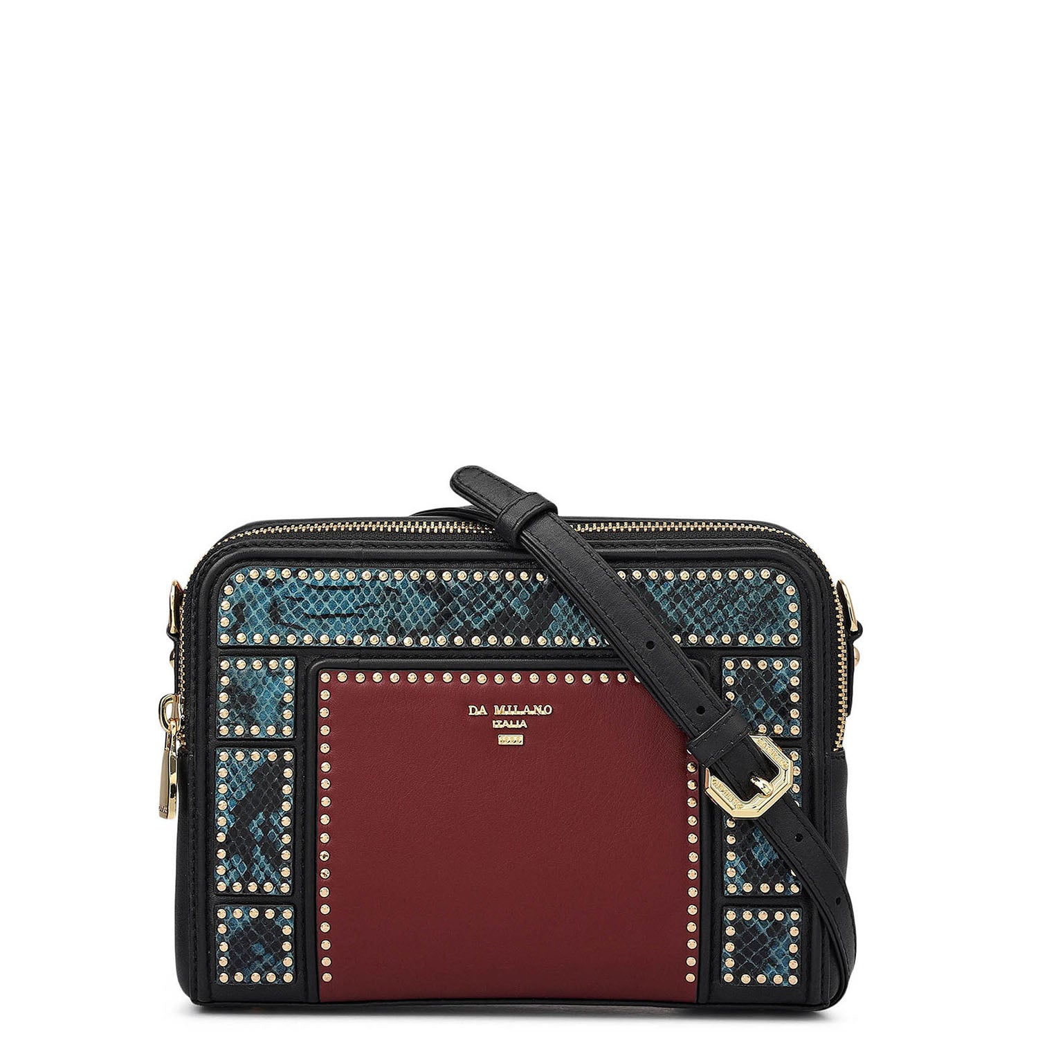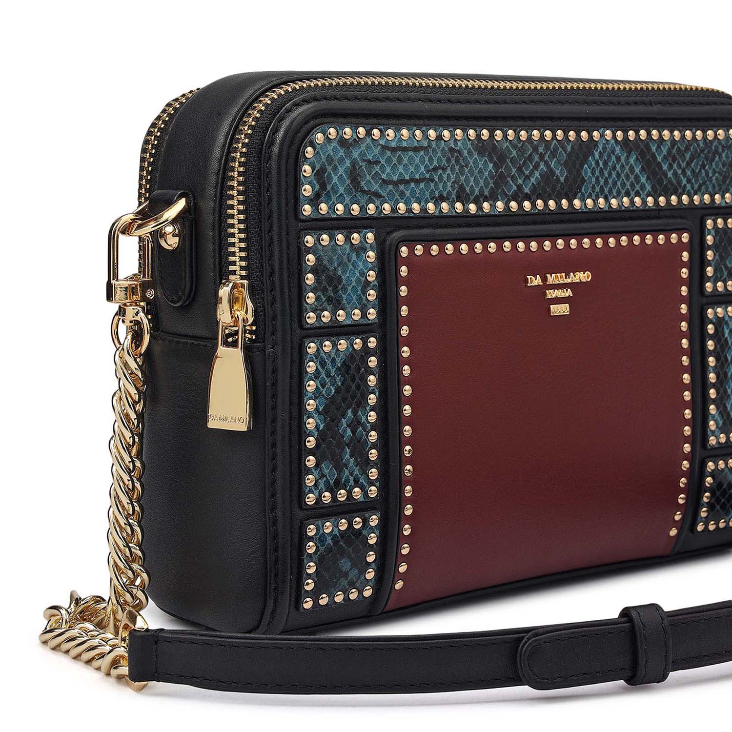The Prive Sling Bag is designed for elevated day-to-evening styling with a sleek, structured silhouette. Crafted in a classic black tone with rich burgundy contrast panels and studded detailing, it brings a bold statement finish while remaining compact and versatile. Secured with a zip closure, the interior opens to an open pocket, zip pocket, and four card slots, offering organised space for daily and evening essentials. Finished with an adjustable and detachable shoulder strap, it can be styled comfortably as a sling or crossbody.