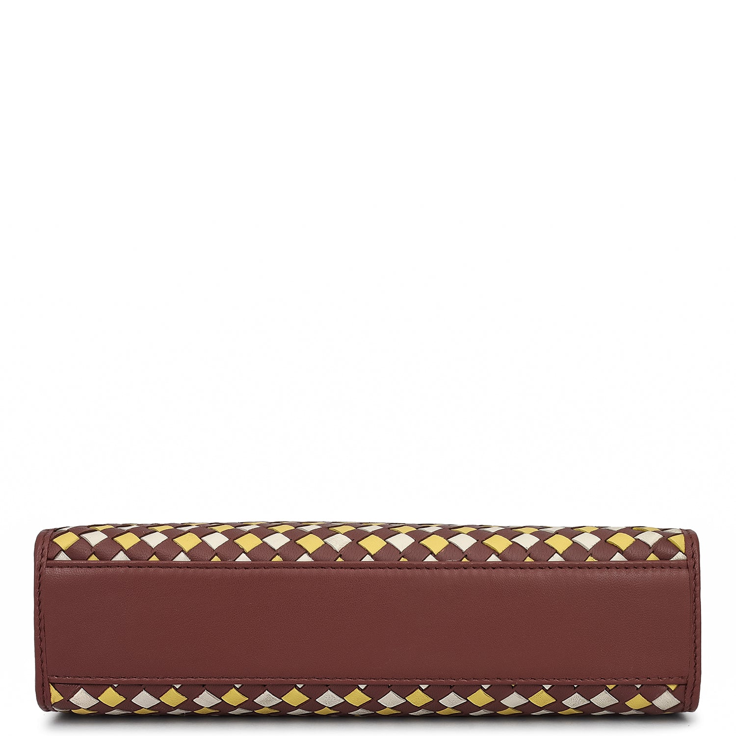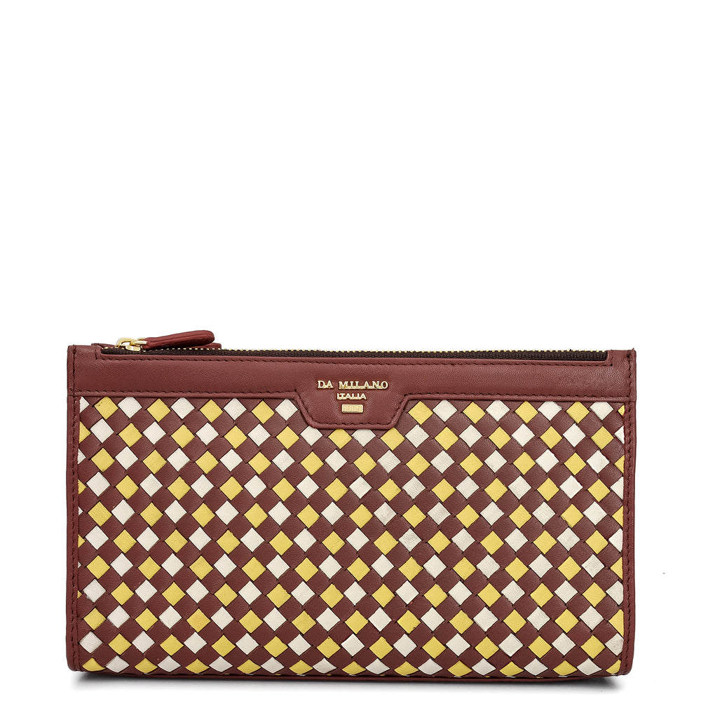 The Tresser Wallet On Chain showcases the collection's unique interlace pattern in a striking burgundy and off-white colour palette. It combines signature woven craftsmanship and compact functionality. The interior, secured by a zip closure, opens to three compartments, three slip pockets, and six card slots for organised, essential storage. It's designed to transition seamlessly from daytime plans to outings.